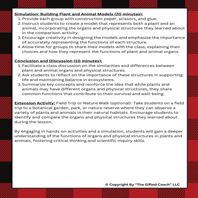 Take your students on an exciting journey through plant and animal biology with this interactive simulation! Aligned to Florida Standard SC.5.L.14.2, this lesson helps learners compare and contrast the organs and physical structures of plants and animals, exploring how both systems are designed to support life. Through engaging role-play, group discussions, and a creative construction project, students will discover the surprising similarities and key differences between the living things around us.