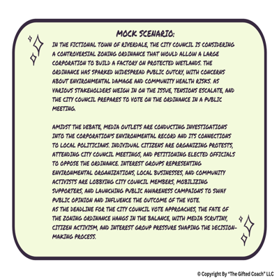 How do citizens, interest groups, and the media shape government decisions? In this hands-on civics simulation, aligned with Florida Standard SS.7.CG.2.8, students explore the power of public opinion and media influence in a democracy. Through engaging role-play and real-world activities, learners will step into the roles of journalists, activists, lobbyists, and everyday citizens to understand how ideas become action in the public arena.