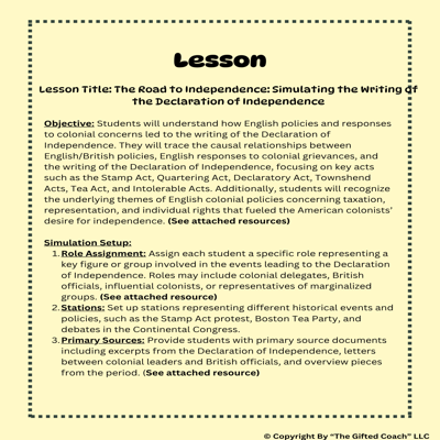 Step into colonial America with this immersive civics simulation, where students investigate the events that led to the drafting of the Declaration of Independence. Aligned to Florida Standard SS.7.CG.1.5, this lesson helps learners analyze the cause-and-effect relationships between British policies—like the Stamp Act and the Intolerable Acts—and the colonists’ growing demand for independence. Through role-play and historical analysis, students connect directly with the motivations behind one of America’s most important founding documents.