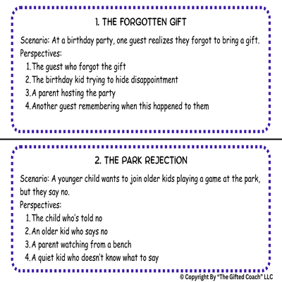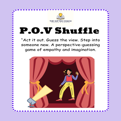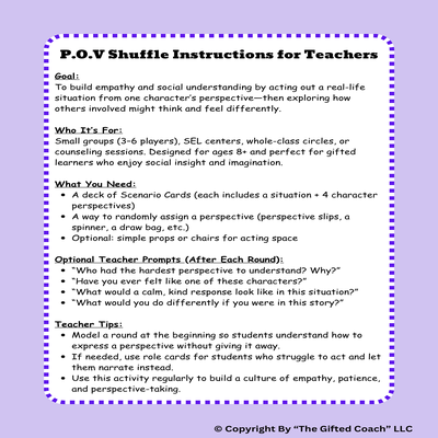 Step into someone else’s shoes with this thought-provoking SEL game that builds empathy, sharpens social reasoning, and strengthens communication. Each round, players act out a mystery perspective from a real-life scenario while others infer what’s happening and who they’re pretending to be. With 30 diverse situations and 120 unique points of view, POV Shuffle turns role-play into real growth—perfect for gifted learners, small groups, and classroom circles. 23 pages